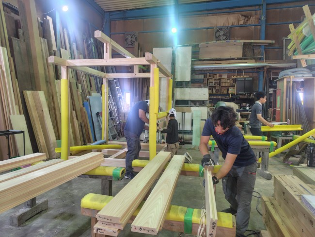 加工場は日本の美しい桧が入り、手刻みの加工が行われていて